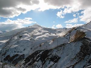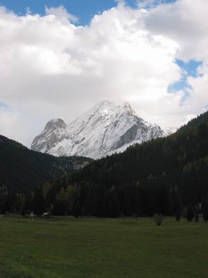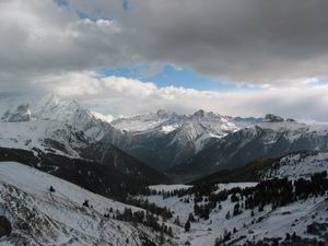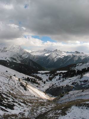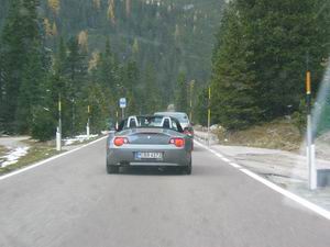 Da überholte uns etwas schemenhaft ein mir unbekanntes Gefährt mit einem BMW-Zeichen - jetzt weiß ich es besser - ein Z4! Doch dann - die Aussicht auf die verschneiten Dolomiten! |